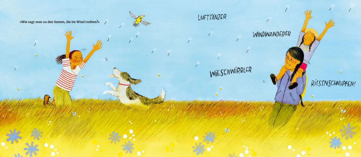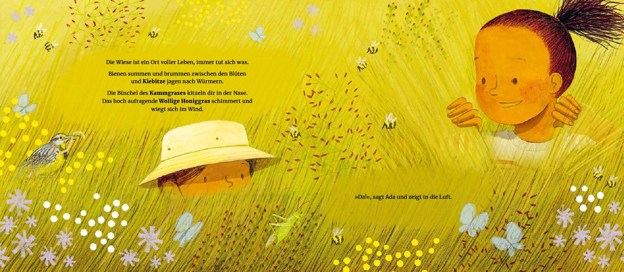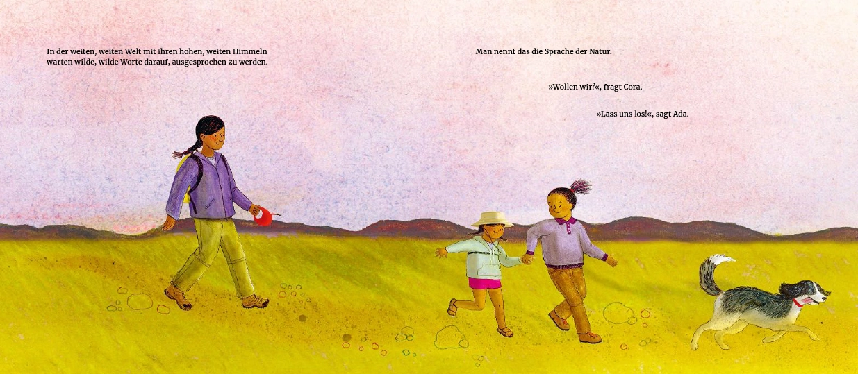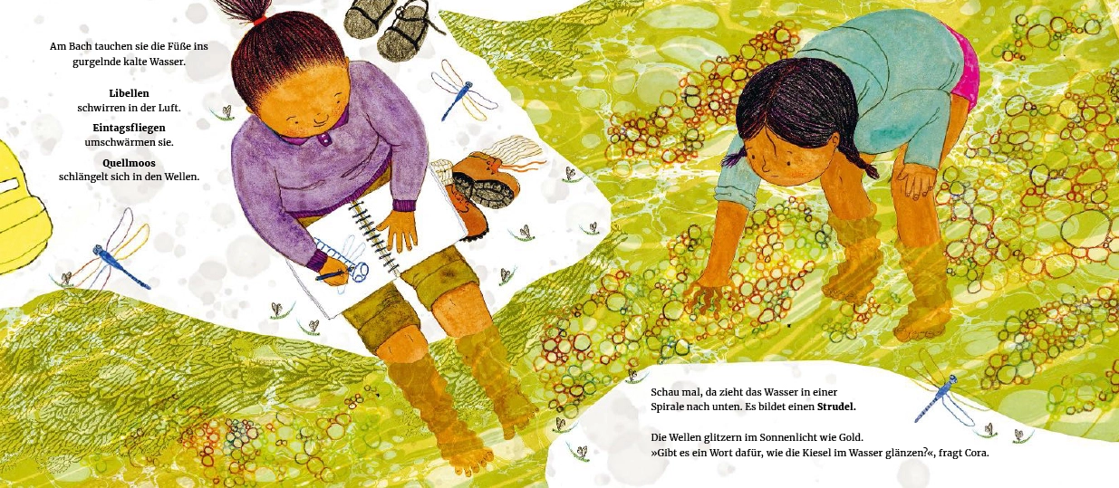 Und schon beginnt ein Spaziergang durch Wiesen, Bäche und Wälder, über Kiesel und unter Wolken. Gemeinsam schauen, staunen und hören die beiden genau hin – und finden Worte für das, was sie erleben.